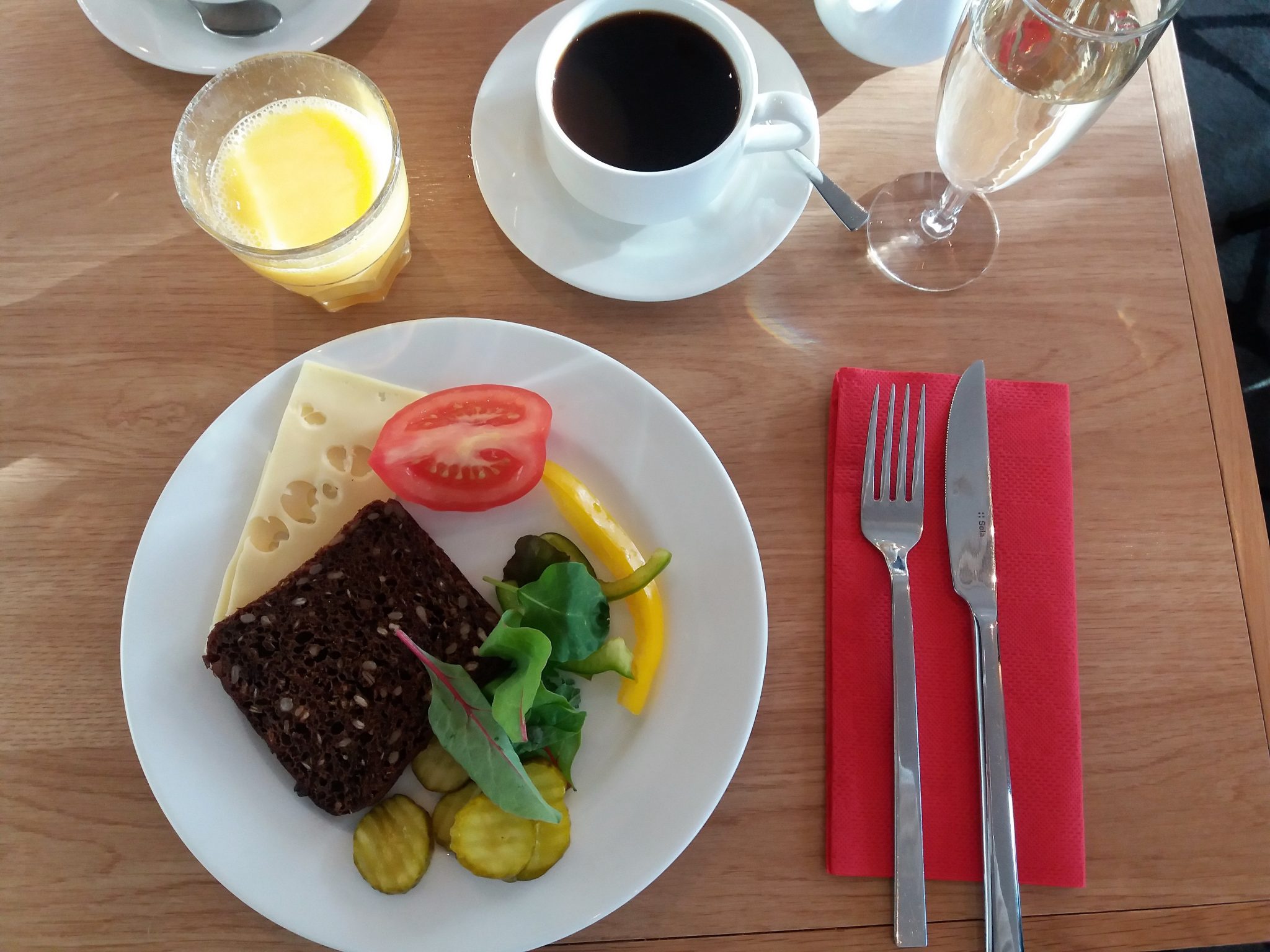 Mies oli vasta matkalla terminaaliin, joten yritin vältellä tiskillä asioimista tekemällä lähtöselvityksen automaatilla. Lähtöselvitysautomaatti ei suostunut yhteistyöhön kanssani, vaikka paikalla ollut virkailijakin yritti saada automaattia toimimaan. Virkailija pyyteli tapahtunutta anteeksi ja ohjasi minut Gold-asiakkaiden tiskille, jossa palvelu oli kaikin puolin yhtä hymyä ja ystävällistä. Oman, varausvaiheessa tehdyn virheen johdosta Gold-asiakkaiden juomakuponkeja tuli vain yhdelle henkilölle, joten jouduin palaamaan mieheni kanssa myöhemmin uudestaan lähtöselvitystiskille selvittämään asiaa. Jälleen kerran asiakaspalvelutilanne oli oikein positiivinen ja tulpahan samalla opittua myös se, että varausta tehdessä kannattaa laittaa kaikkien klubilaisten korttinumerot mukaan etujen saamiseksi.
