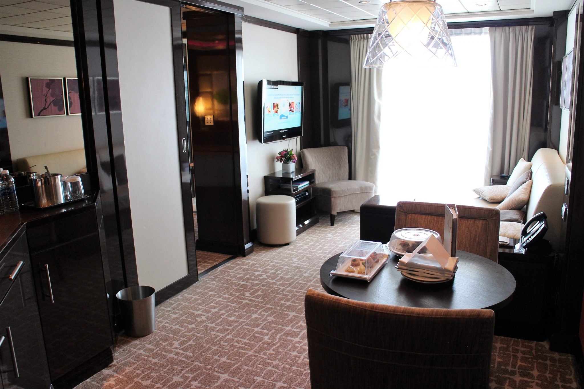 Viikon ajan kelluvan hotellimme huoneena toimi kokonaispinta-alaltaan noin 47 m²:n kokoinen The Haven 2-Bedroom Family Villa, eikä hyttiluokkavalintamme olisi voinut olla onnistuneempi. Riittävästi tilaa, rauhaisa parveke ja kaksi makuuhuonetta, molemmat omilla kylpyhuoneillaan. Me ateriomme useammankin kerran sviitissä, vietimme aikaa parvekkeella ja ehdinpä ottaa yhden kylvynkin upeassa kylpyhuoneessa ohi lipuvia merimaisemia ihaillen.