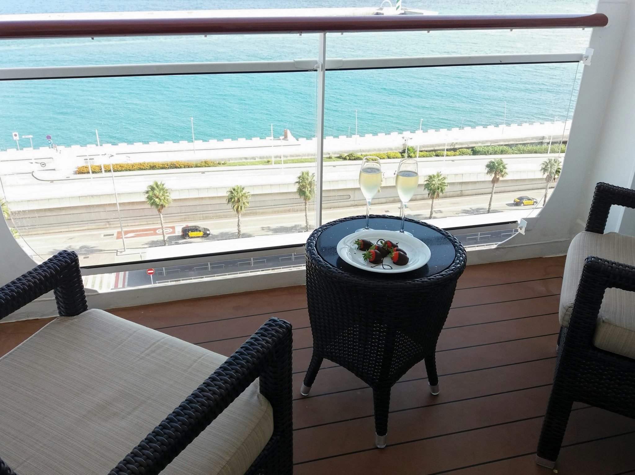 Sviitin hintaan kuulunutta butleria me käytimme matkan aikana ihan kiitettävästi. Sviitti-illallinen jäi tilaamatta ajanpuutteen vuoksi, mutta pikkupurtavia tuli tilattua ja kahtena aamuna nautimme kiireettömän aamiaisen oman sviitin rauhassa. Parasta olikin ottaa kahvikupponen tuoreiden hedelmien kanssa parvekkeelle ja ottaa ilo irti siitä lämmittävästä auringosta, jota ei kyllä tänä kesänä tässä maassa näkynyt. Että juu, katkeria ollaan.