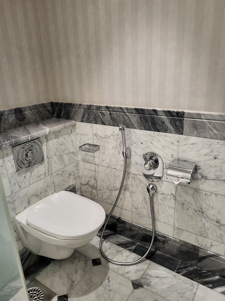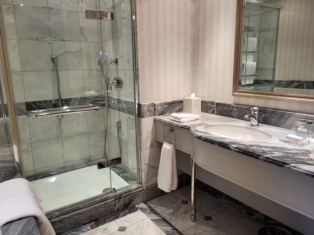 Huoneen marmorinen kylpyhuone oli ihanan iso. WC-tila oli eritelty väliovella kylpyhuoneesta ja kylpyhuoneessa oli iso, syvä amme sekä erillinen suihkukaappi. Peseytymistuotteet olivat ESPAn ja huoneluokkaan kuului myös lainaksi kylpytakit ja -tossut.