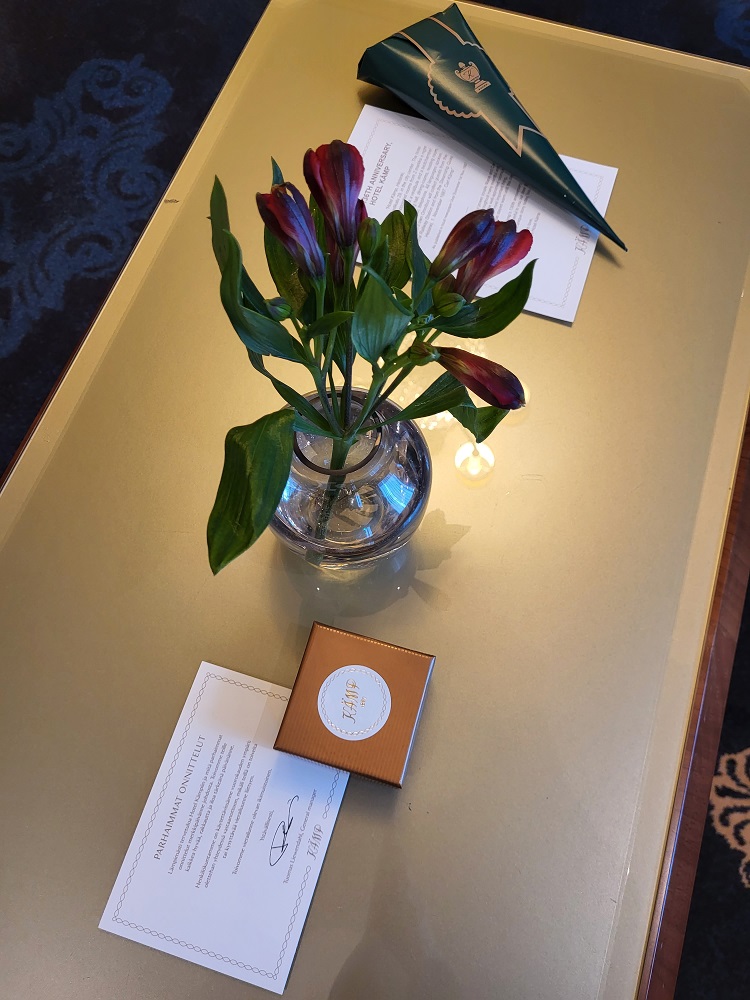 Olen majoittunut useamman kerran viiden tähden hotellissa ja juhlinut merkkipäiviä alempienkin tähtien (*** – ****) hotelleissa. En ole ennen eläissäni juhlapäivän tai paremman huoneluokan tervehdyksessä saanut niin persoonatonta tervehdyskorttia kuin viiden tähden Hotel Kämpissä.