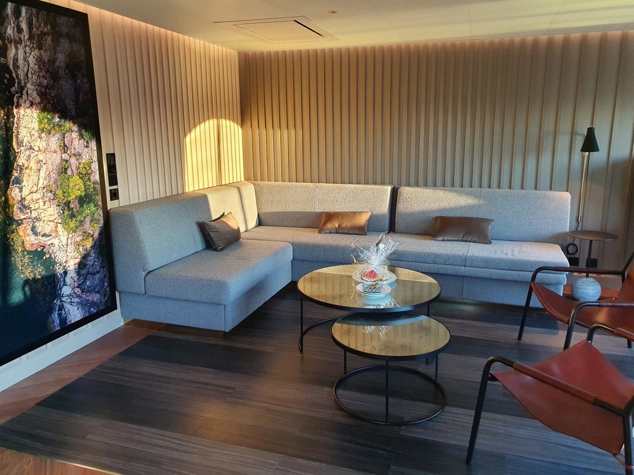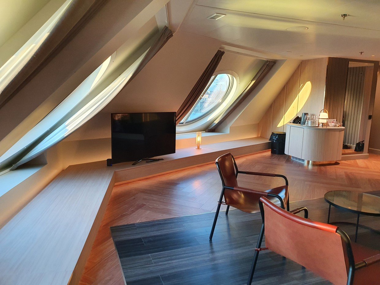 Sviitin olohuoneen sohvasta saa lisävuoteen kahdelle alle 18-vuotiaalle lapselle. Sviitissä odottaa matkailijaa hedelmävati ja minibaarin antimet (75 cl kokoinen kuohuviini, kaksi olutta, neljä virvoitusjuomaa ja kaksi pulloa vettä), kaikki edellä mainittu maksuitta. Matkatavarat saa mukavasti säilytykseen vaatehuoneeseen ja säilytystilaa on muutoinkin mukavasti, sillä makuuhuoneen puolelta löytyy vielä erillinen pieni vaatekaappi ja syvennys, jossa on vaatetanko. Kylpytakit (ei -tossuja), hiustenkuivaaja ja vedenkeitin kahvi- & teetuotteineen kuuluu varustukseen myös. Televisioita on kaksi ja ikkunoita merimaisemin ihailuun yhteensä viisi, joista kolme on olohuoneen puolella.