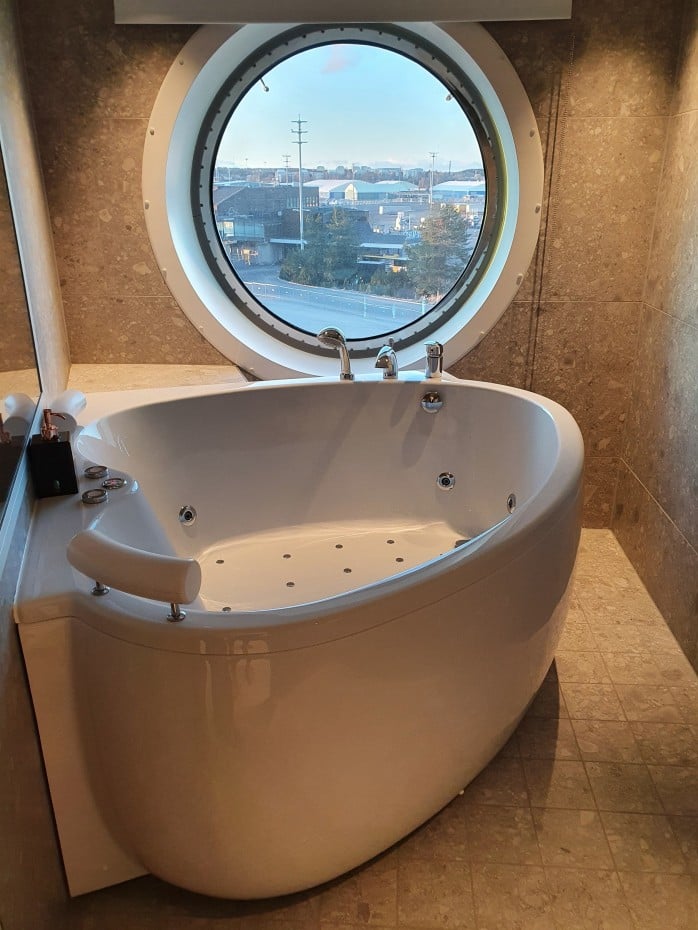 - Viking Gloryn sviitti kannattaa kokea edes kerran elämässä. Tilaa on ja kahteen suuntaan avautuvat yhteensä viisi ikkunaa mahdollistavat saaristomaisemien ihailun rauhassa laajemmaltikin. Plussaa siitä, että jokaisesta löytyy se poreamme ja sviitit ovat erilaisia väritykseltään. Ei tarvitse siis olla kiinni vain siinä yhdessä vaihtoehdossa (vrt. Viking Grace), jos haluaa poreammeellisen sviitin.