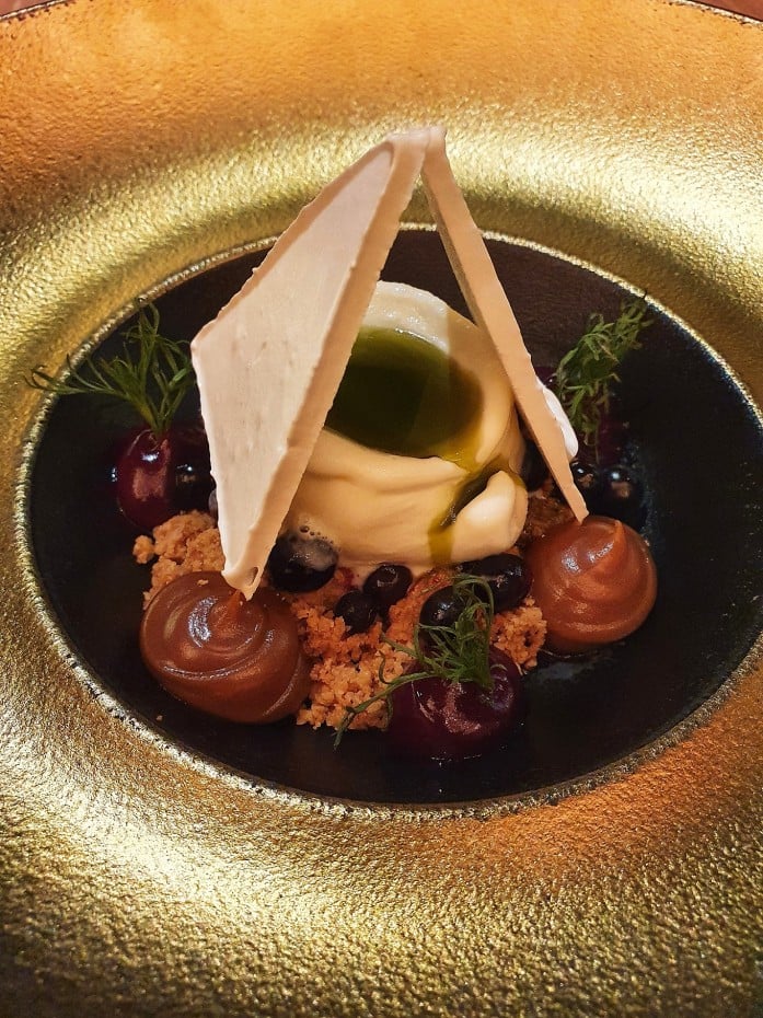 Ja lopuksi yllättävien makujen sekoitus jäkiruoan muodossa: Mänty, tuorejuusto ja mustaherukka.