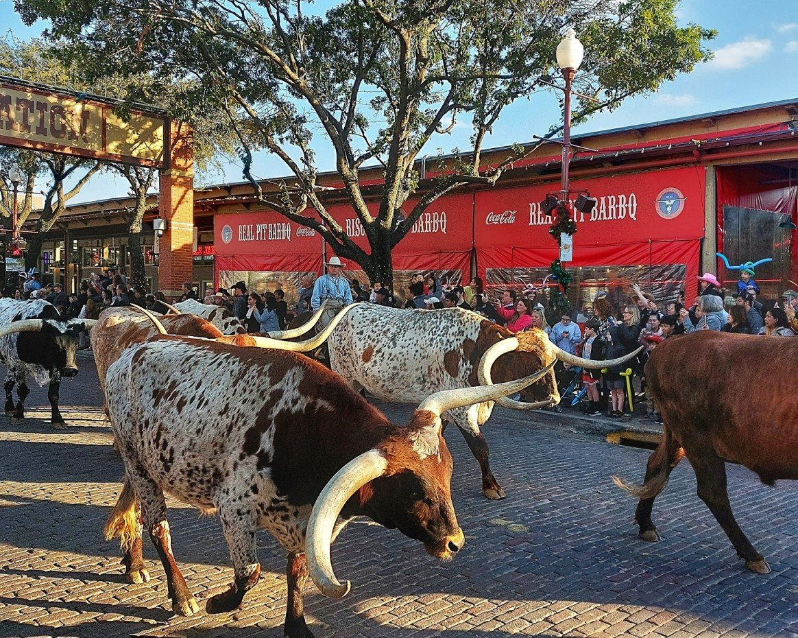 Päädyttiin Texasin turneella myös Forth Worthiin ja ”eksyttiin” Stockyards National Historic Districtille juuri oikeaan aikaan, jolloin Texasin kuuluisaa Texas Longhorn lihakarjaa oltiin esittelemässä ihmettelevälle kansalle. Näiden veikkosten sarvet on kyllä mahtavaa kokoa, kuulemma isoin sarviväli voi olla jopa 2,4 metriä. Ei passaa tommosen kanssa käydä kisailemaan.